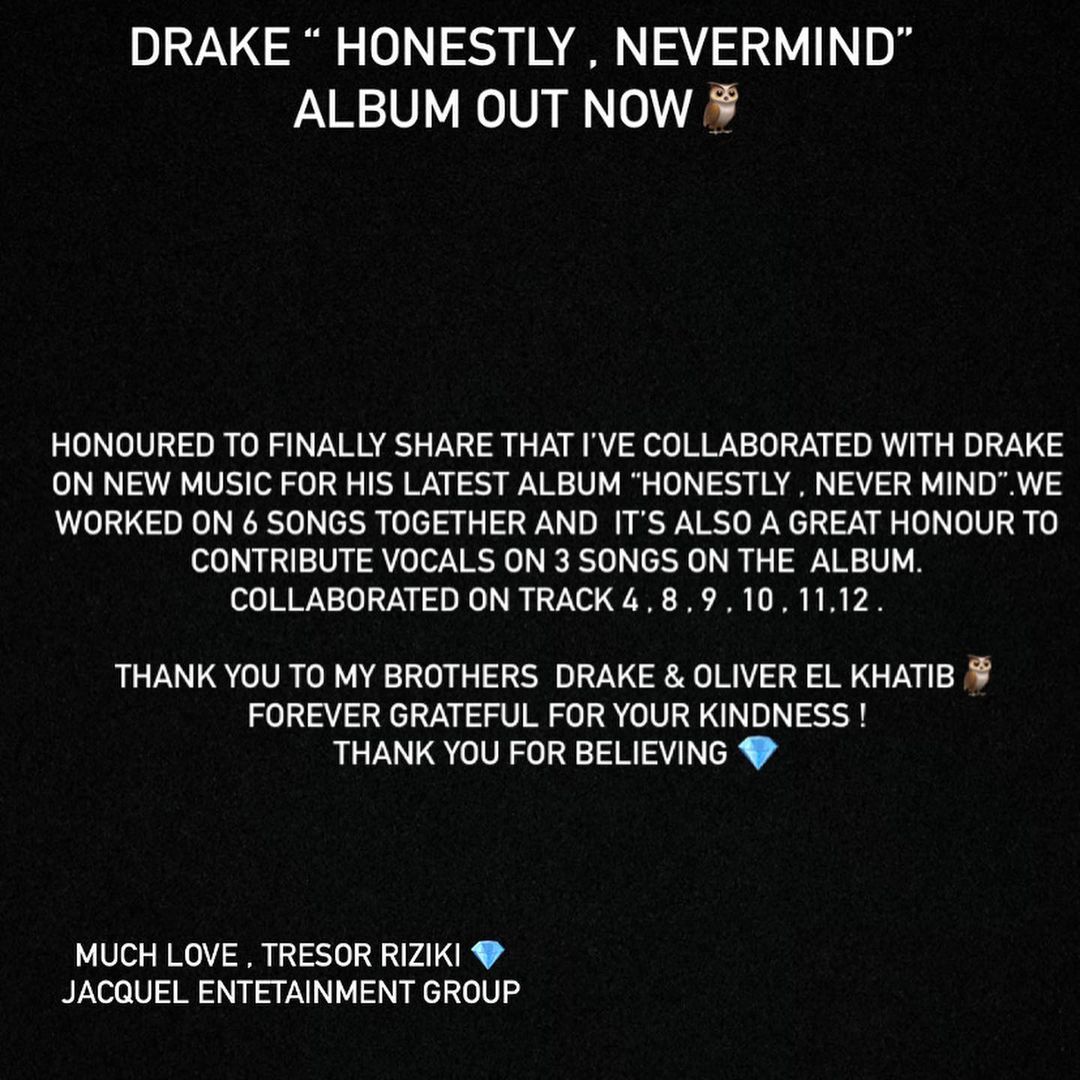 “I’m honoured to finally share that I’ve collaborated with Drake on his new music for his latest album. Thank you to my brothers Drake and Oliver El-Khatib. I’m forever grateful for your kindness. Thank you for believing in me,” shares TRESOR.