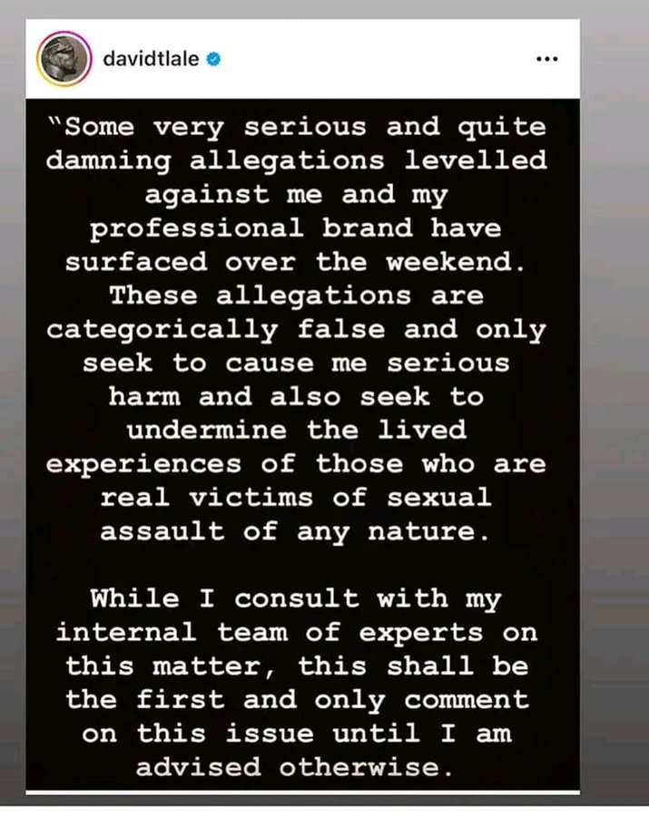 “Some very serious and quite damning allegations levelled against me and my professional brand have surfaced over the weekend. These allegations are categorically false and only seek to cause me serious harm and also seek to undermine the lived experiences of those who are real victims of sexual assault of any nature.