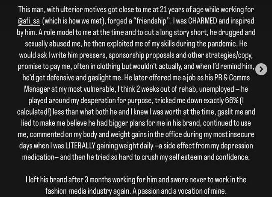 “I was charmed and inspired by him. A role model to me at the time, and to cut the long story short, he drugged and sexually abused me. He then exploited me for my skills during the pandemic,” Zack wrote.