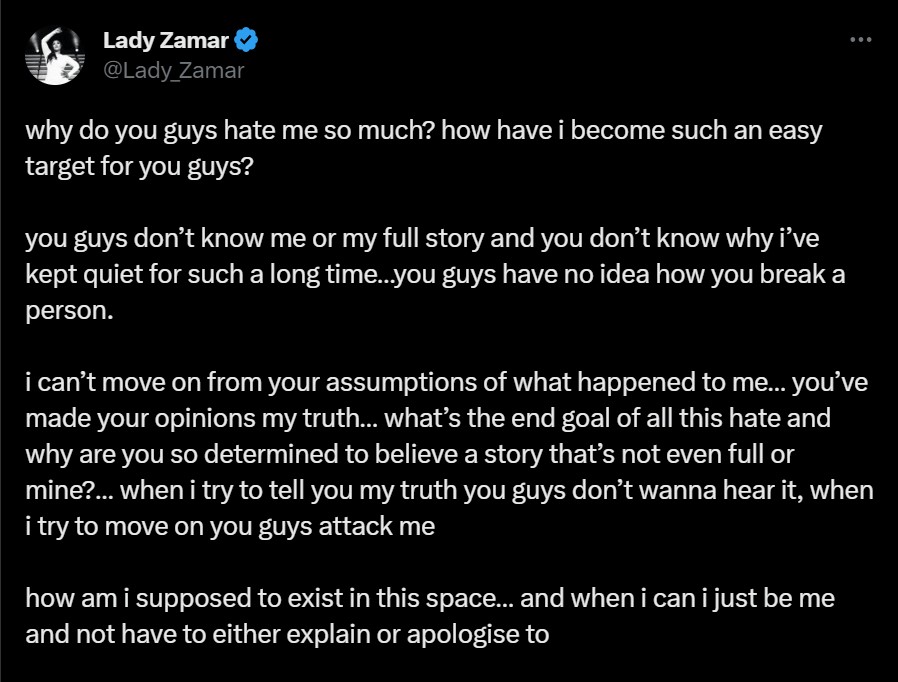 The post detailed her frustration with people not letting her move on and with the public making it difficult for her to just be. “I can’t move on from your assumptions of what happened to me… you’ve made your opinions my truth… what’s the end goal of all this hate and why are you so determined to believe a story that’s not even full or mine?… when I try to tell you my truth you guys don’t wanna hear it, when I try to move on you guys attack me,” she said on the post.