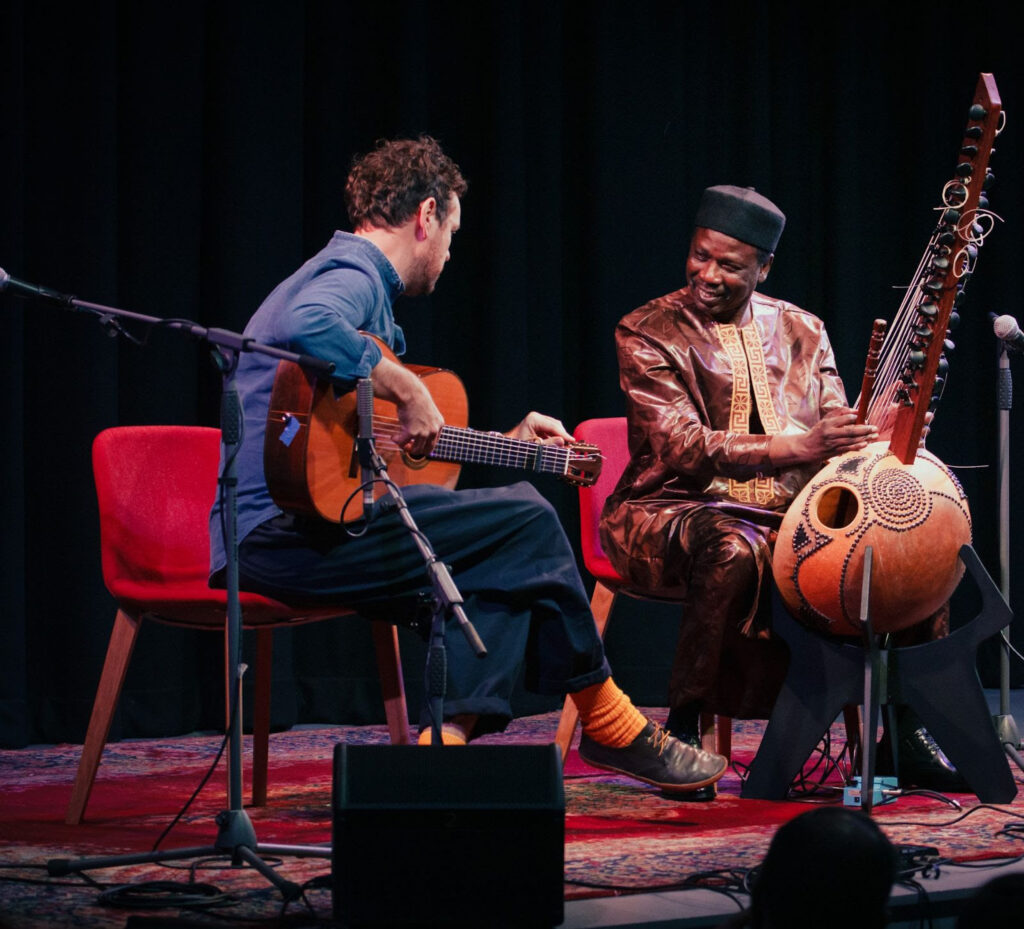 A meeting between instruments, not traditions. Most certainly, the dialogue between Ballaké Sissoko’s Kora and Derek Gripper’s guitar is a summit between two master musicians who are operating with control and freedom at the highest peaks of their art. There are two bulls in the pen. And it is equally certain that these maestros emerge from quite different and distant musical worlds – Sissoko’s kora tradition and lineage traverse the once powerful empire known as Kaabu: located in Gambia, southern Senegal, and Guinea Bissau. Gripper’s stems from the European classical guitar.