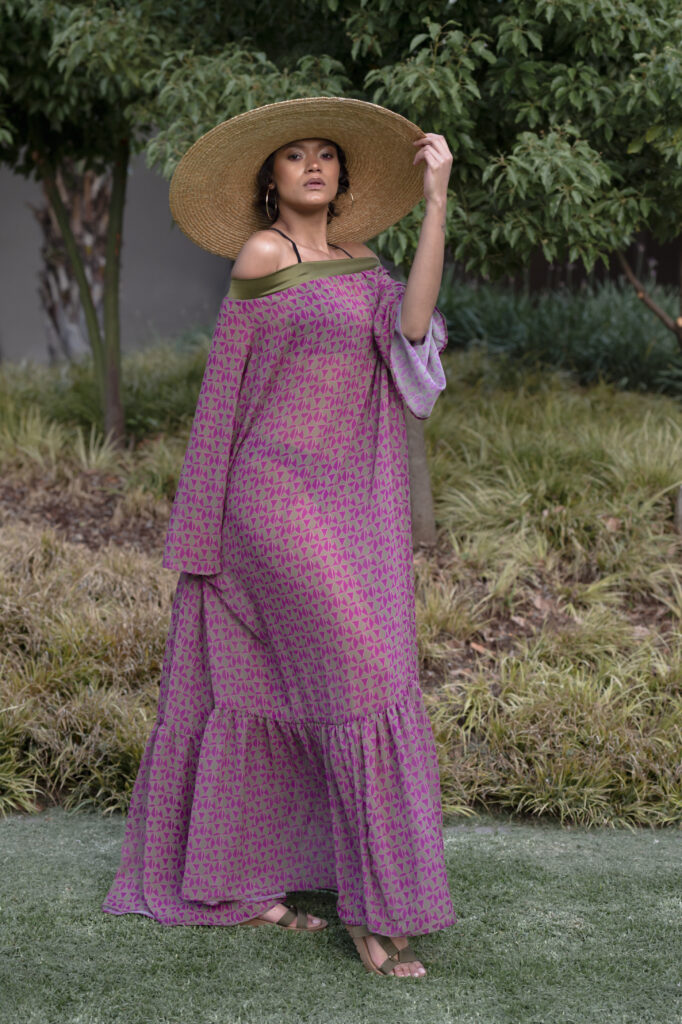 This print continues harmoniously throughout the collection. Litema is the creation of geometric patterns and designs which are subtle and organic in color. To this end look forward to a warm and earthly tones, with hints of bright hues, as this speaks to the summer resort wear theme. Think Mango Orange, Butter Yellow, Olive Green, Deep Pink, and Pacific Blue. Satins and silks are prevalent because of their beautiful shine and luxurious feel. Other flowy soft textured fabrics which feature in the collection are Chiffon, Linen Gauze, Viscose, Mesh and Crepe. Predominantly A-Line silhouettes were favored because of their light, loose fitting, and flowy nature. COMFORT IS KEY FOR THE WEARER.
