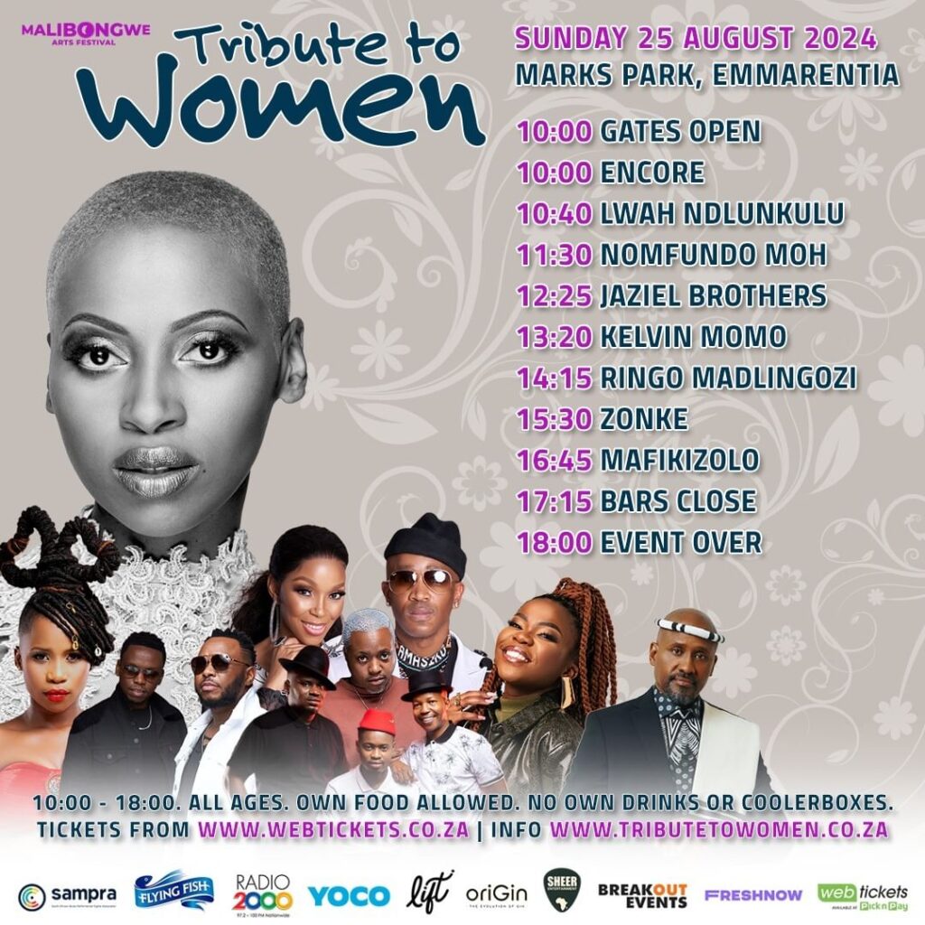 Join us at Mark’s Park, Emmerentia, on Sunday, 25 August 2024, as we come together to celebrate the women who have shaped our past and continue to influence our future, and connect with Malibongwe Artist Festival “Tribute To Women” on social media for more news.