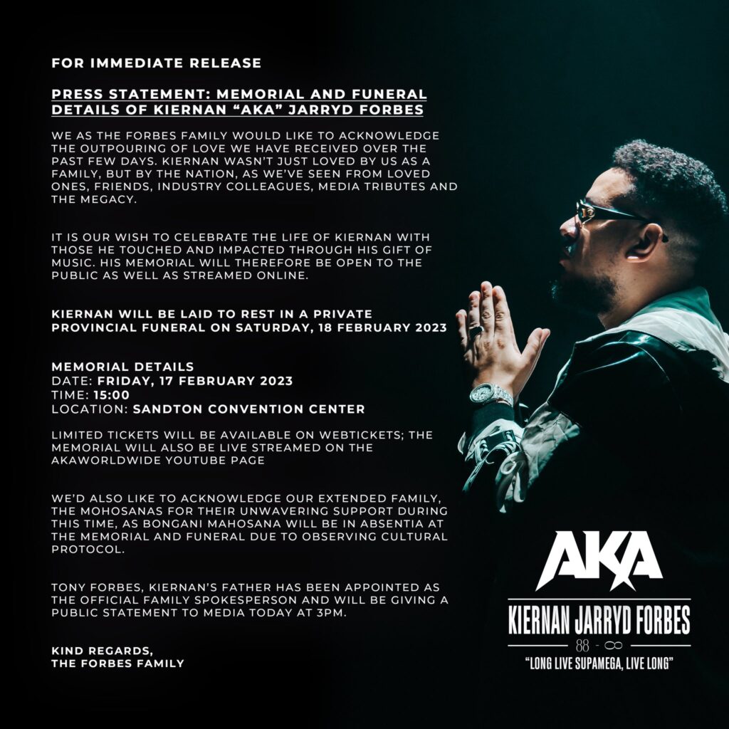 A statement released by AKA’s family read: “It is our wish to celebrate the life of Kiernan with those he touched and impacted through his gift of music. His memorial will therefore be open to the public as well as streamed online,” while Tibz family said, “the Motsoane family are deeply moved by the national outpouring of love and support over the past few days. Financial contributions are welcomed by the family at this time.”