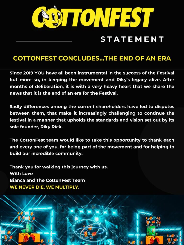 It is with heavy hearts that the organisers of CottonFest today announced that the festival has come to an end.
