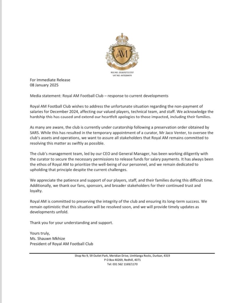 As club owner of Royal AM, Mkhize issued a formal statement in which she laid her cards on the table concerning the matter of her employees, including the players, of the club not receiving their salaries from December. She explained that this hiccup was linked to SARS seizing the club for investigation.