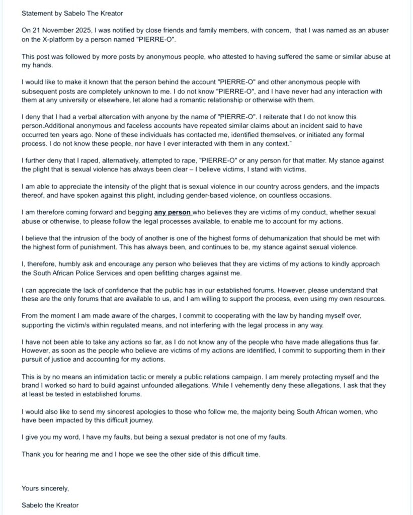 Content creator Sabelo the Kreator has broken his silence after a whirlwind of rape allegations were thrown at him on the 21st of November 2025 on X. Following an emotional weekend in which the country turned black and purple as women nationwide protested against the scourge of Gender-Based Violence, Sabelo distributed a statement on his social media accounts, clarifying his stance while denying the accusations levelled against him.