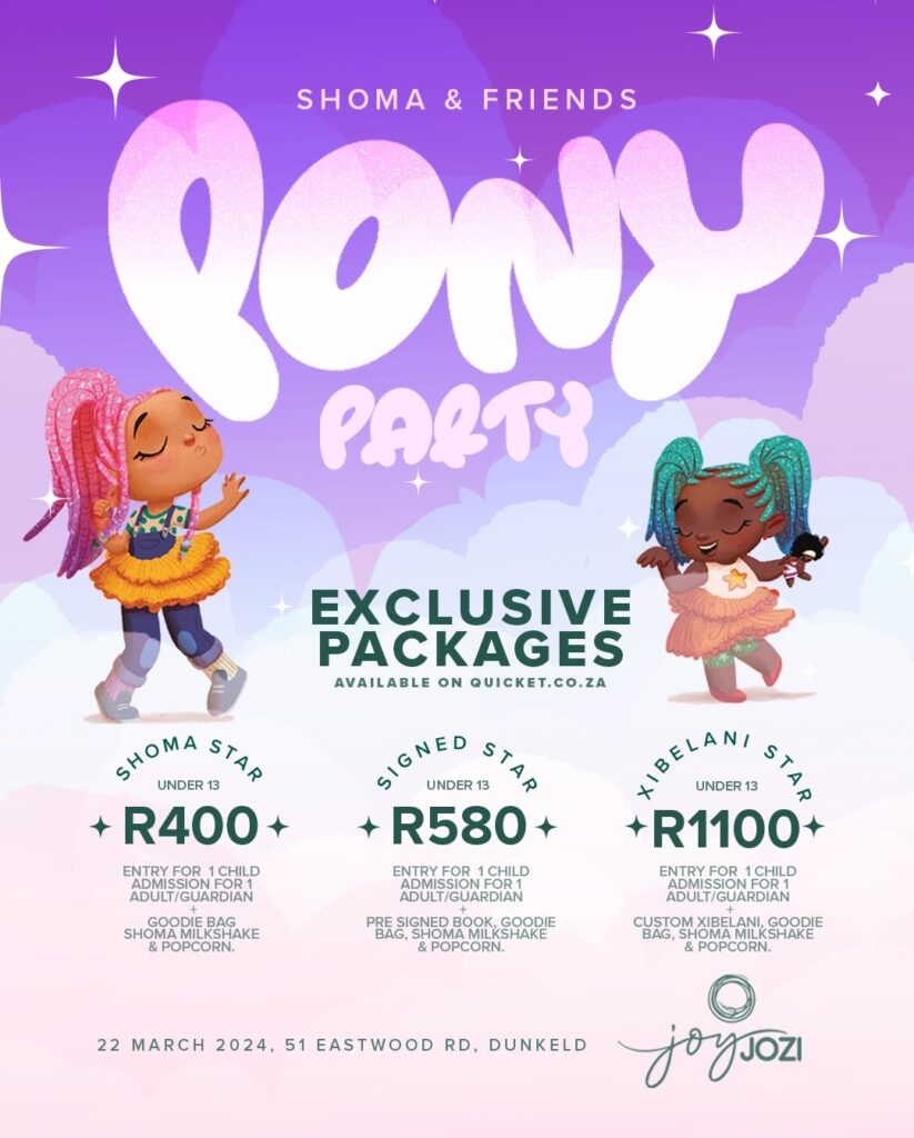 The Shoma & Friends Pony Party takes place this Friday, 22 March 2024 at 3pm at Joy Jozi restaurant in Hyde Park, Johannesburg and is set to be a fun-filled afternoon where Sho Madjozi will be doing her special first Meet and Greet of the year, while launching her Sparkle Pony hair concept.