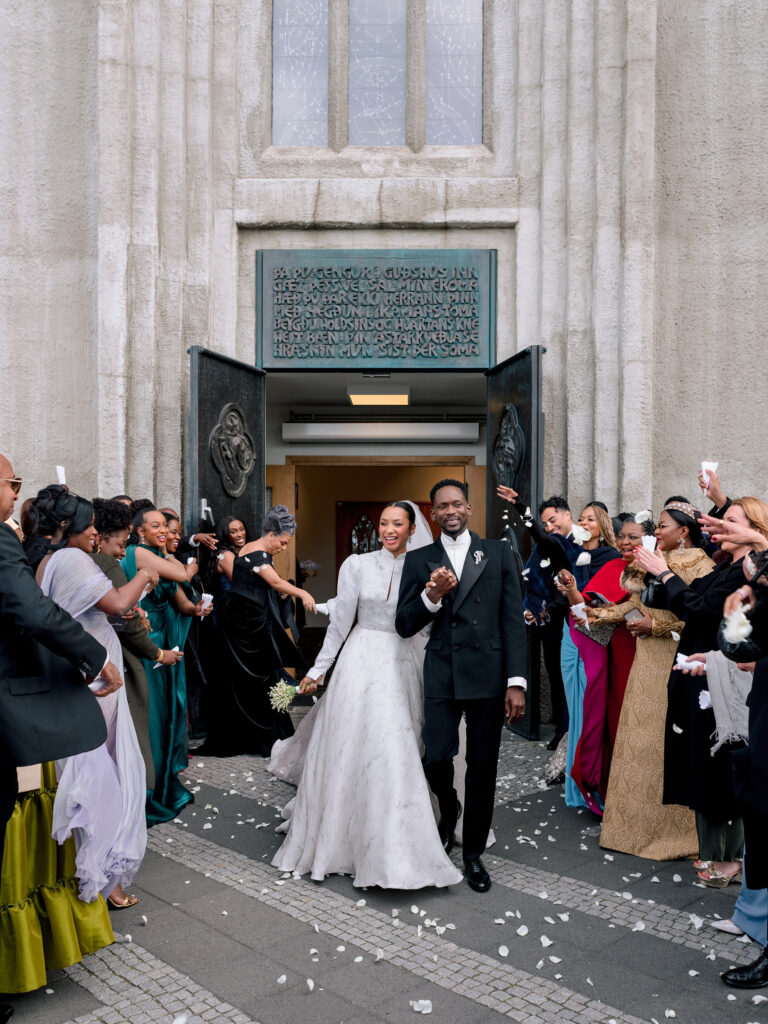 The trilogy culminated in Iceland on August 8, 2025, a country that has become a sanctuary for the couple since their first visit in 2021. At Reykjavík’s iconic Hallgrímskirkja Cathedral, Pastor Tash Kusi (HTB London) blessed the union in a ceremony attended by just under 80 guests. Temi wore a custom Fendi gown with Briony Raymond jewelry, while Eazi wore Saint Laurent.